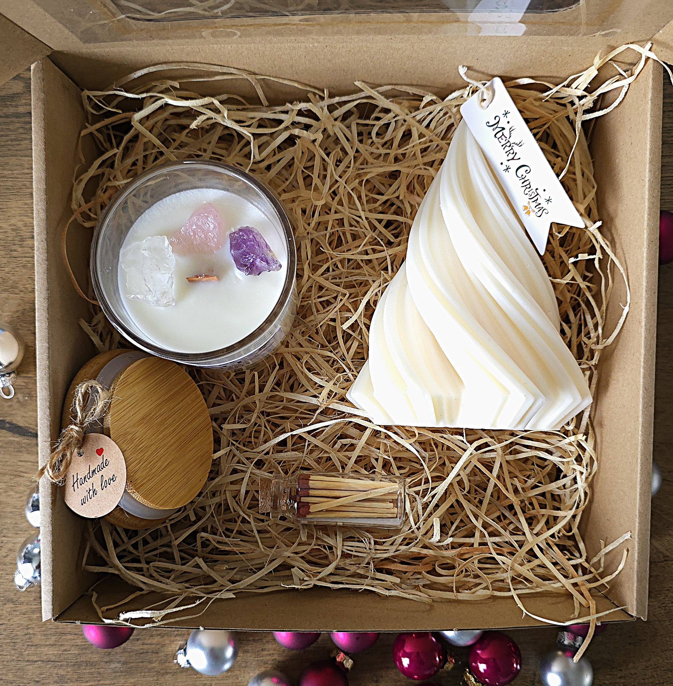 Inside, you’ll find a True Vibe Candle in the Euphory scent, a large handcrafted Christmas tree candle (size: 14 x 10 cm | 240g), and a charming glass bottle of matches, all made from eco-friendly soy wax for a cleaner, healthier burn.