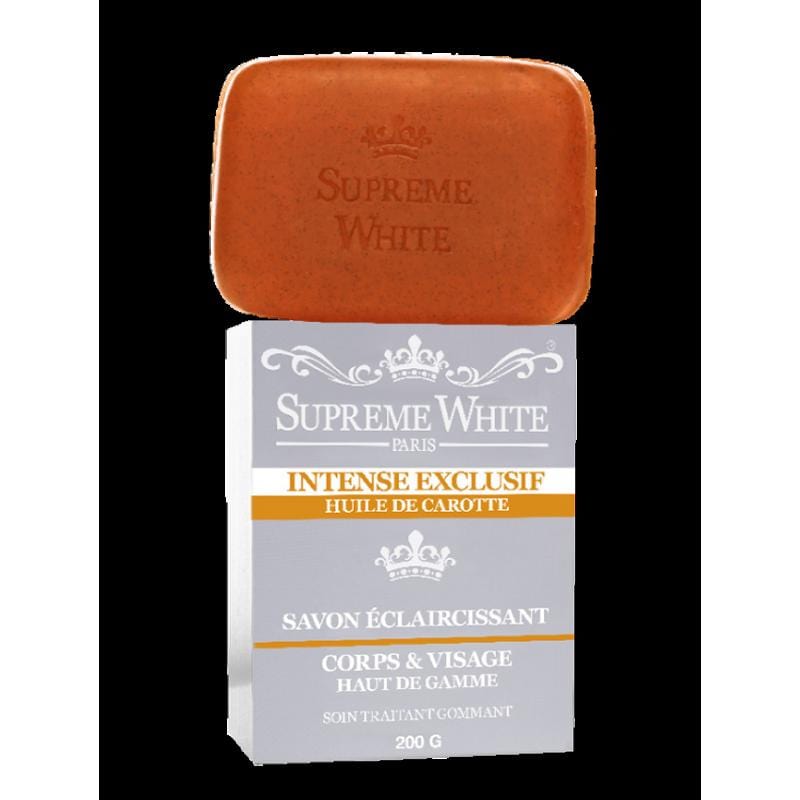 Supreme White Savon Exfoliant Eclaircissant Intense Exclusif Extrait de Carotte: Exploiter les bienfaits de la nature, élaborée avec le plus grand soin par le labo Dermaclean le lait INTENSE EXCLUSIF Révélateur d’Éclat est un cocktail d'actif éclaircissant raffermissant en un soin hydratant pour le corps.